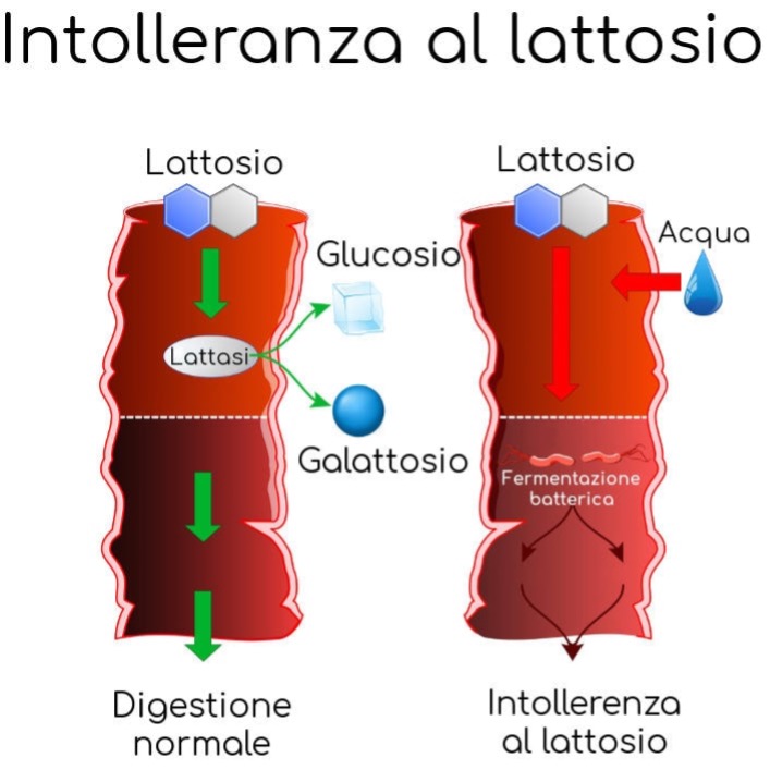 Il lattosio, zucchero caratteristico del latte e dei latticini, è un disaccaride composto dall’unione dei due monosaccaridi: glucosio e galattosio. Affinché il lattosio possa essere assorbito dai villi intestinali, tale legame dev’essere necessariamente scisso, liberando i due monosaccaridi che vengono poi assorbiti a livello digiuno-ileale (tratti intermedi e finali dell’intestino tenue). Artefice di tale evento è l’enzima lattasi, predisposto appunto alla digestione del lattosio.